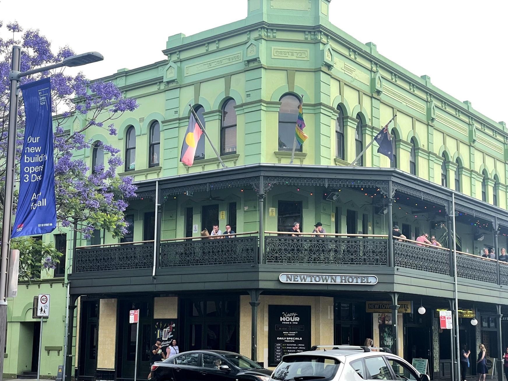Newtown Hotel is the kind of corner pub that feels like it’s seen everything – and is still very much up for more. Inside you get indie‑leaning bar vibes, pool tables, cheap but decent cocktails and a crowd that runs from baby gays to seasoned locals, all spilling between the street‑level bar and that famous first‑floor balcony over King Street.